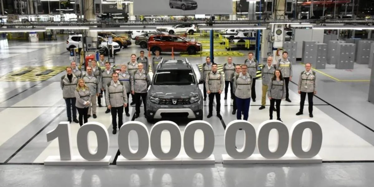 Un Duster Extreme Gris Urbain tout juste sorti de la chaine de montage, prend la pose pour une photo commémorative et hautement symbolique. Il s’agit en effet du 10 millionième véhicule Dacia produit depuis la naissance de la marque.