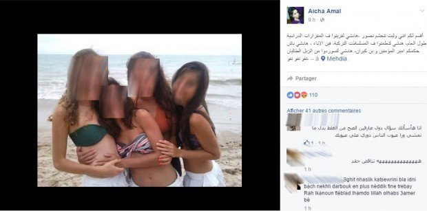 Une utilisatrice de Facebook nommée Aicha Amal invite les internautes à prendre en photo des femmes en maillot afin de prévenir le vice et dénoncer la débauche des femmes marocaines.