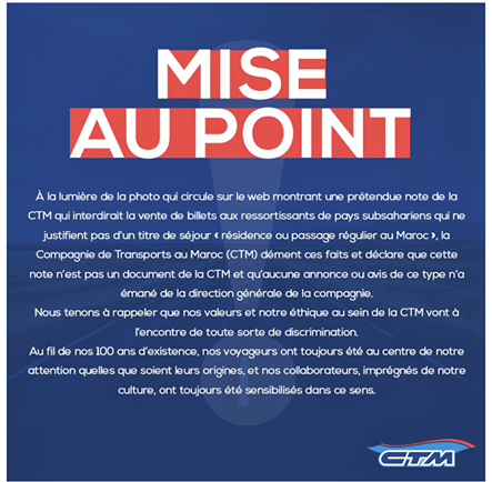 Après le tollé provoqué par cette note, la CTM, accusée de racisme, de ségrégation et de délit de faciès par les internautes, est sortie de son silence et a démenti les faits. «A la lumière de la photo qui circule sur le web montrant une prétendue note de la CTM qui interdirait la vente de billets aux ressortissants de pays subsahariens qui justifient pas d’un titre de séjour «résidence ou passage régulier au Maroc», la Compagnie de Transport au Maroc (CTM) dément ces faits et déclare que cette note n’est pas un document de la CTM et qu’aucune annonce ou avis de ce type n’a été émané de la direction générale de la compagnie», a expliqué la compagnie dans une mise au point.