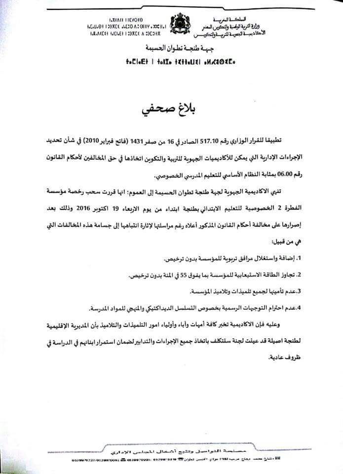 Un mois seulement après le début de l’année scolaire, 217 enfants tangérois se retrouveront à la rue à cause de la fermeture de leur école. Cette dernière a reçu un communiqué non signé de l’académie régionale de Tanger-Tétouan-El Hoceima lui annonçant la fermeture de l’établissement à partir du mercredi 19 octobre 2016 (voir copie ci-dessous).