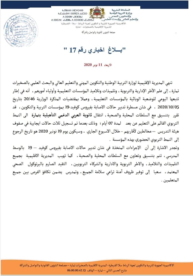 La direction provinciale du ministère de l’éducation nationale à Skhirat-Témara a annoncé que cette mesure durera jusq’au 19 novembre.
