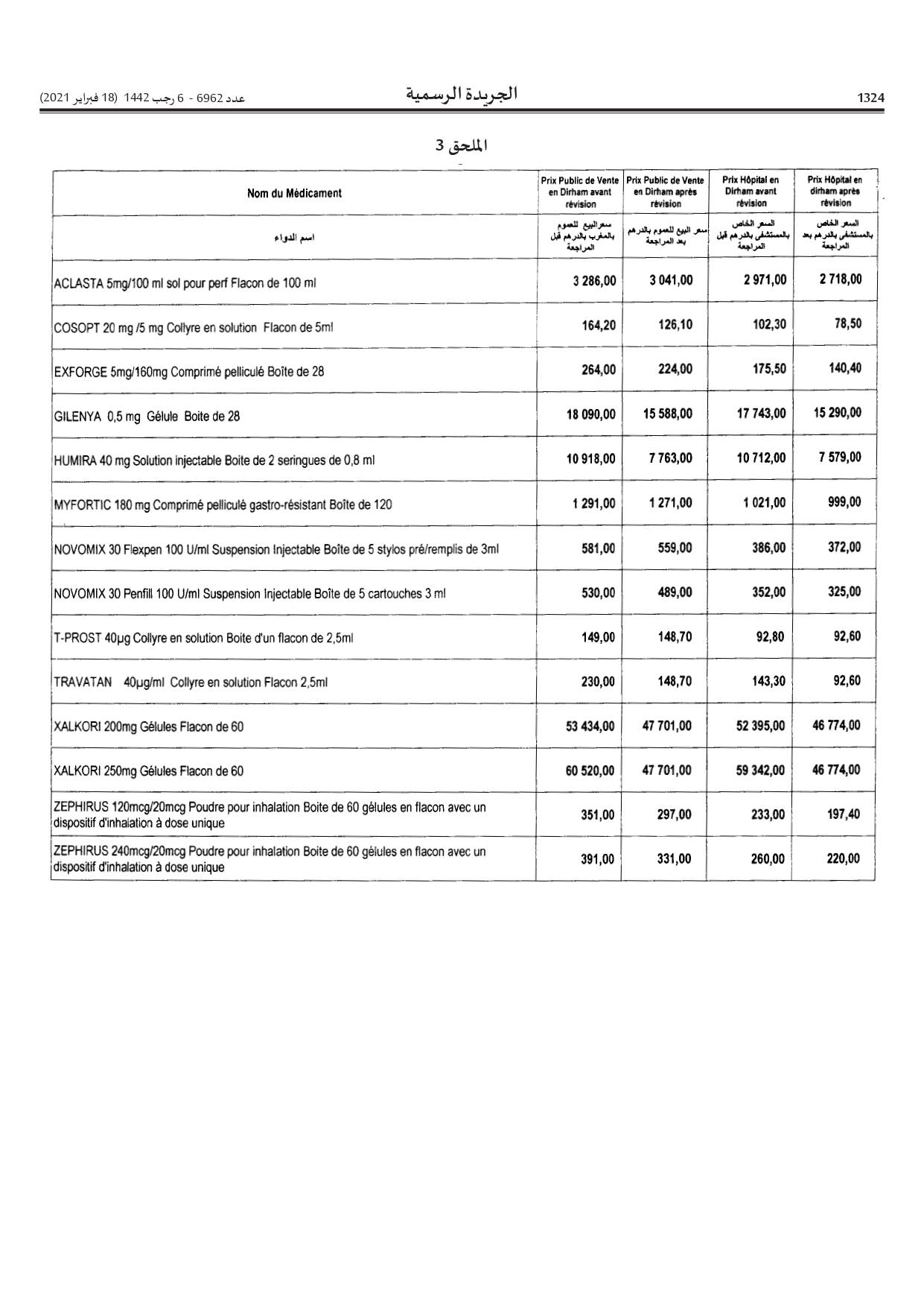 La liste des 52 médicaments dont le prix à baisser a été publiée au Bulletin officiel du 18 février 2021. On y retrouve notamment des médicaments utilisés dans le traitement contre le cancer.