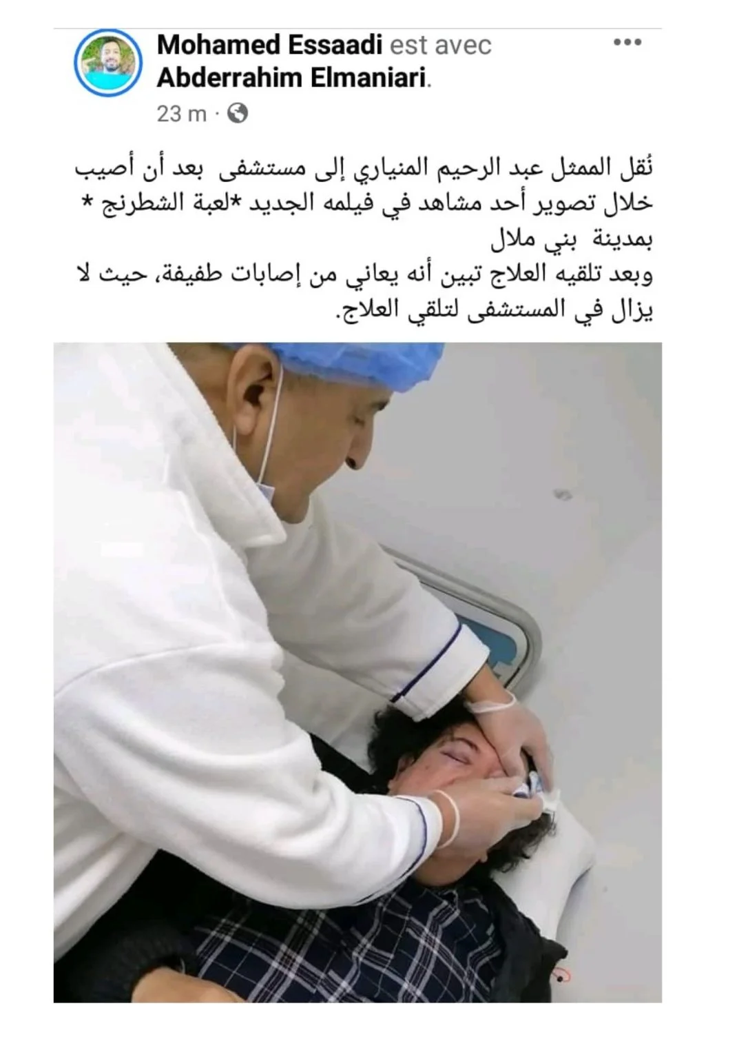 Sur son compte Facebook, l’acteur Mohamed Essaadi a déclaré que l’acteur a été transféré à l’hôpital après avoir été blessé lors du tournage d’une scène de son nouveau film « Le jeu d’échecs », dans la ville de Béni Mellal.