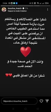 Vendredi soir, Bouchra Ahrich a donné des nouvelles sur son état de santé pour rassurer ses fans. Sur son compte Instagram, l’artiste a posté une story. « Merci pour vos appels et vos messages. J’ai dû être hospitalisée en urgence à cause d’un problème à l’estomac provoqué par le surmenage. Le médecin a insisté afin que je passe la nuit à la clinique. Je me porte mieux maintenant », a-t-elle écrit.