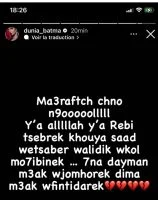 « Je ne sais pas quoi dire. Que dieu t’arme de patience toi et tes parents ainsi que tes fans mon frère Saad. Nous serons toujours derrière toi et ton public restera toujours dans ton attente », souligne Dounia Batma sur son compte Instagram.