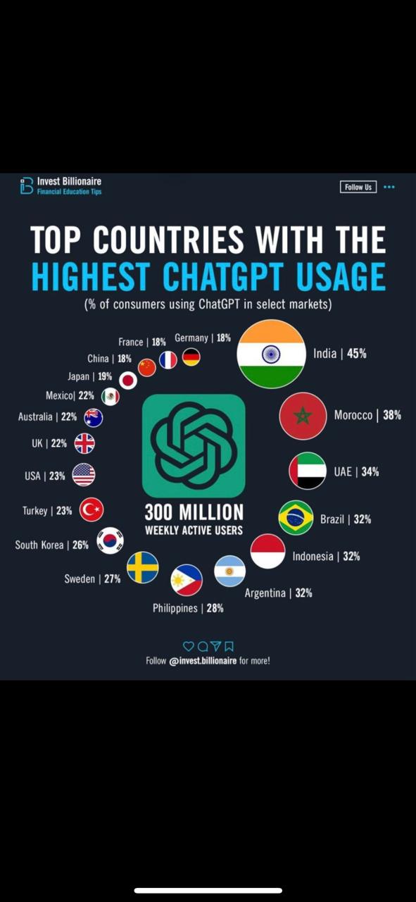 Selon une enquête menée par Invest Billionnaire , l’Inde est le pays comptant la plus grande proportion d’utilisateurs de ChatGPT, avec 45 % des personnes interrogées déclarant utiliser cet outil d’intelligence artificielle générative.