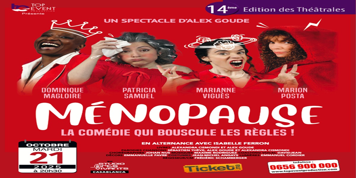 Après avoir conquis plus de 100 000 spectateurs en France, la comédie musicale « MÉNOPAUSE – La comédie qui bouscule les règles » arrive pour la première fois au Maroc, le mardi 21 octobre 2025 au Studio des Arts Vivants de Casablanca.