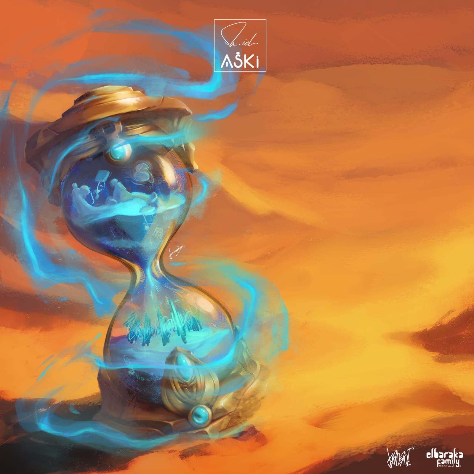 Le visuel principal met en scène Mr. ID dans un désert incandescent, marchant tel un voyageur initiatique, tenant un sablier-talisman.