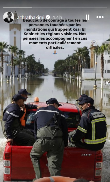 Sur son compte Instagram, l’international marocain a ainsi tenu à afficher sa solidarité avec les habitants de Ksar El Kébir. «Beaucoup de courage à toutes les personnes touchées par les inondations qui frappent Ksar El Kébir et les régions voisines. Nos pensées les accompagnent en ces moments particulièrement difficiles», a-t-il écrit sur son compte Instagram.