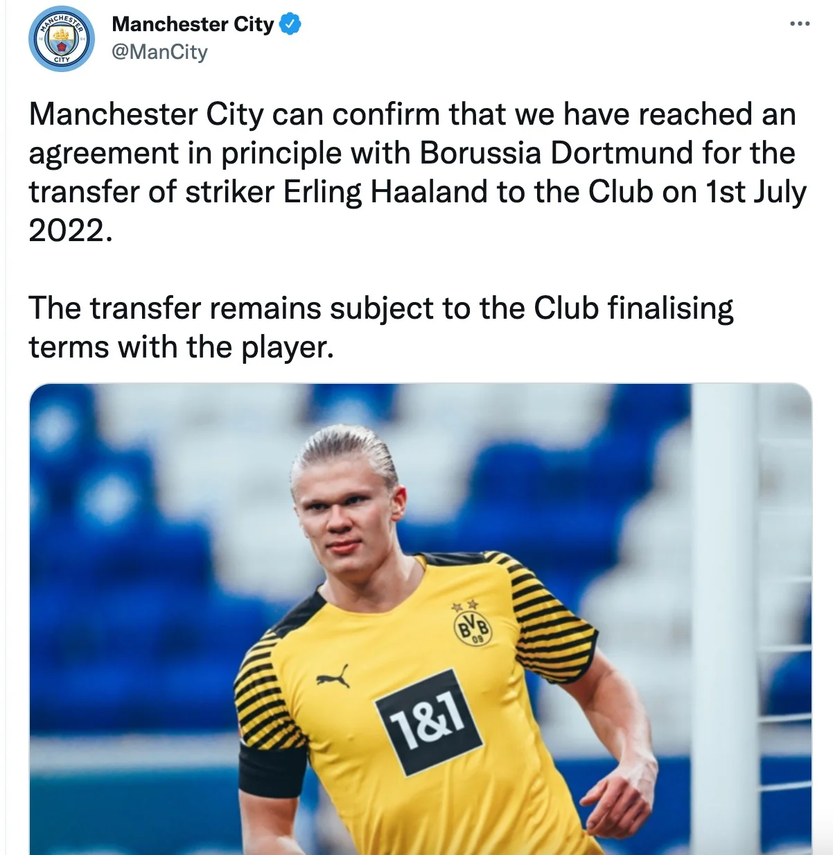 « Manchester City peut confirmer que nous avons trouvé un accord de principe avec le Borussia Dortmund pour le transfert de l’attaquant Erling Haaland au club le 1er juillet 2022 », indiquent les Citizens dans un communiqué. Le transfert reste soumis à la finalisation des termes avec le joueur par le club, précise la même source.