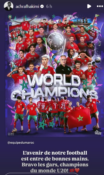 Sur son compte Instagram, l’international marocain a partagé une photo des Lionceaux de l’Atlas et a écrit : «L’avenir de notre football est entre de bonnes mains. Bravo les gars, champions du monde U20».
