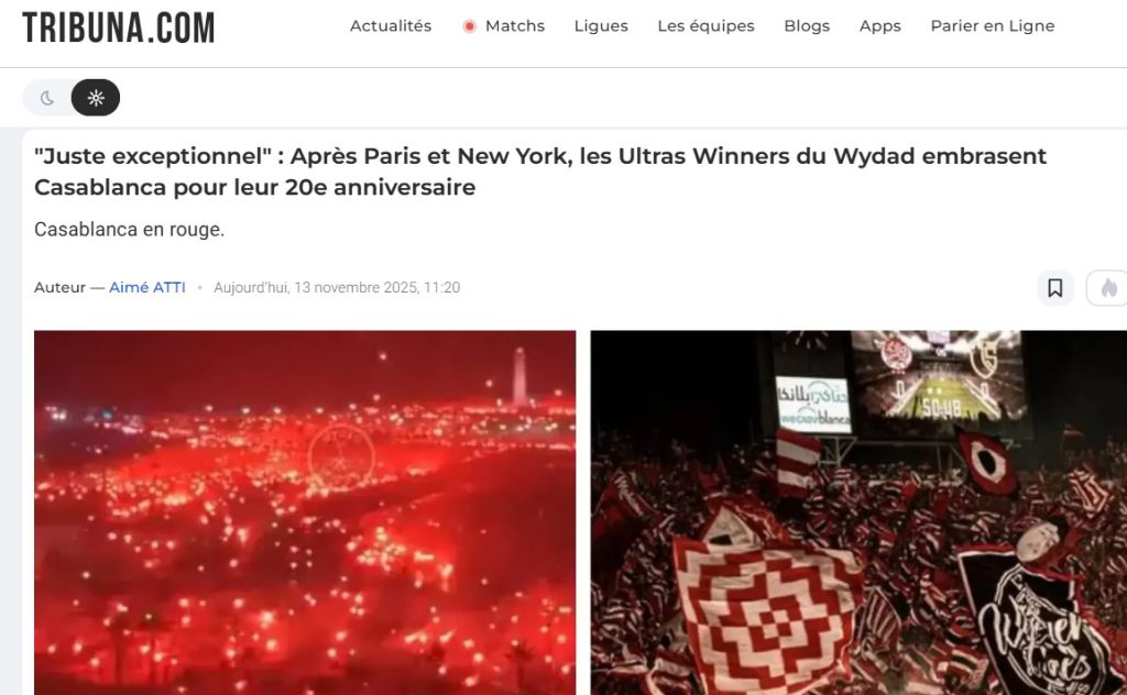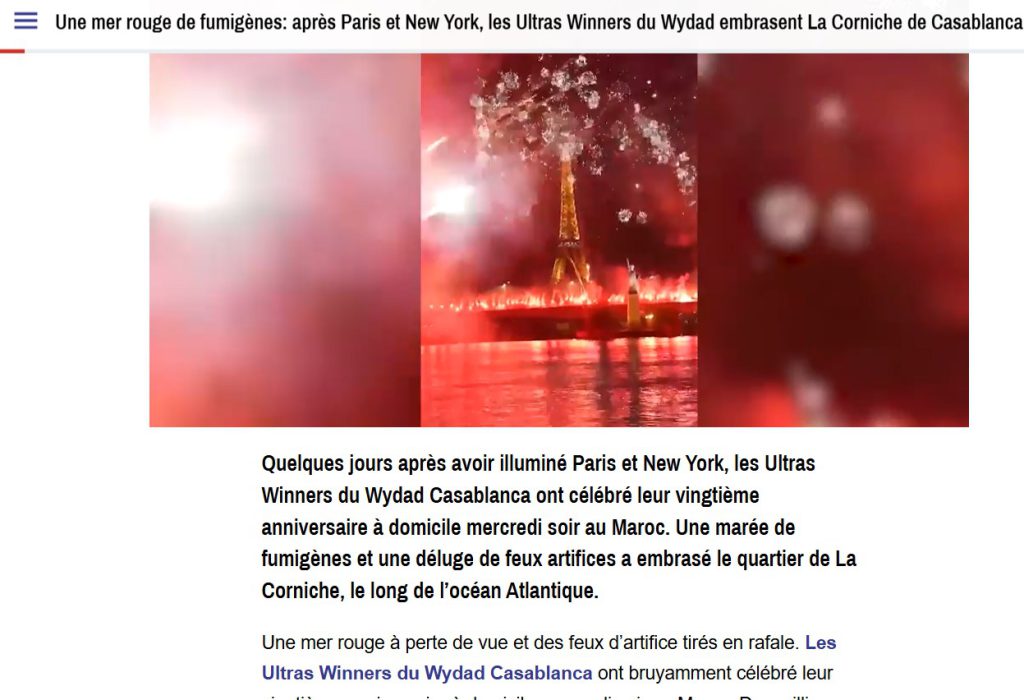 Le média français RMC a ainsi rapporté que, “ quelques jours après avoir illuminé Paris et New York, les Ultras Winners du Wydad Casablanca ont célébré leur vingtième anniversaire à domicile mercredi soir au Maroc », décrivant «une mer rouge à perte de vue et des feux d’artifice tirés en rafale».
