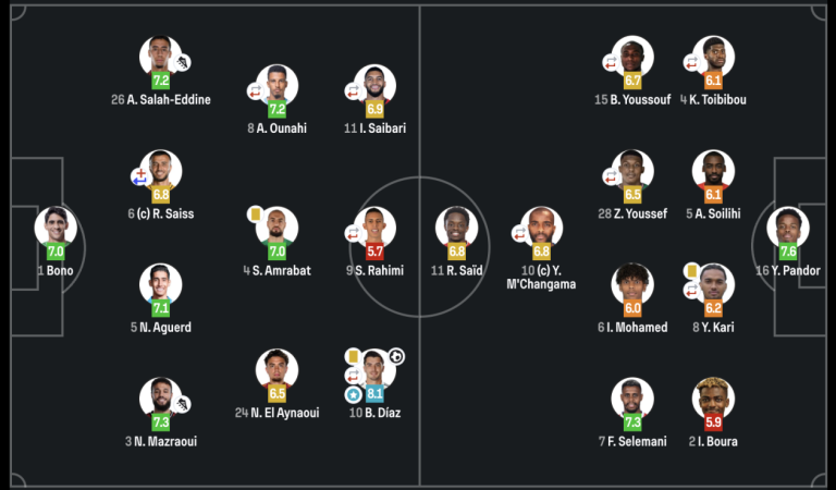 Auteur du premier but du Maroc, Ibrahim Diaz a obtenu la note de 8,1, soit la meilleure parmi les joueurs de la sélection nationale, tandis que la plus faible évaluation (5,7) est revenue à Sofiane Rahimi.